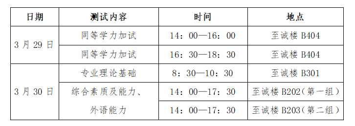 综合素质及能力、外语能力测试请于开始前半小时达到候考室至诚楼B301。